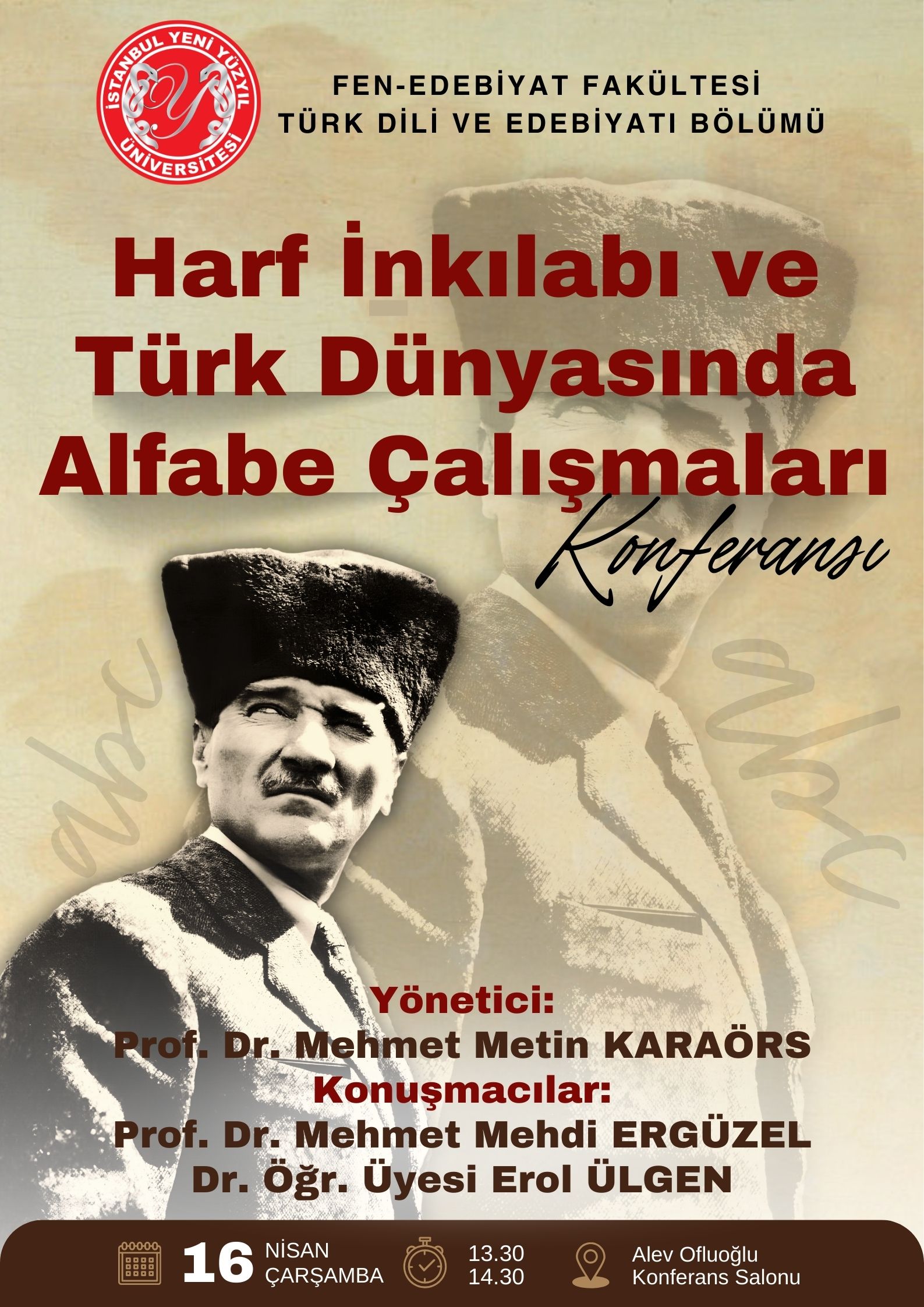Fen Edebiyat Fakültesi Türk Dili ve Edebiyatı Bölümü tarafından düzenlenen ve Bölümün Öğretim Üyesi Prof. Dr. Sayın Mehmet Metin KARAÖRS'ün yönettiği, Prof. Dr. Sayın Mehmet Mehdi ERGÜZEL ve Dr. Öğr. Üyesi Sayın Erol ÜLGEN'in konuşmacı olduğu "Harf İnkılabı ve Türk Dünyasında Alfabe Çalışmaları" başlıklı konferans, 16 Nisan 2025 Çarşamba günü 13.30-14.30 saat aralığında Alev Ofluoğlu Konferans Salonu'nda gerçekleşecektir.