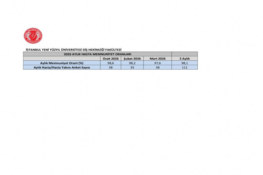 İstanbul Yeni Yüzyıl Üniversitesi Diş Hekimliği Fakültesinde Ocak-Mart 2026 süresince yapılan hasta memnuniyeti anketinde %98 oranına ulaşıldı. Bu yüksek oranın yakalanmasında fakültemizde sürdürülen kalite güvenliği çalışmalarının önemli etkisi oldu.