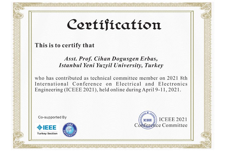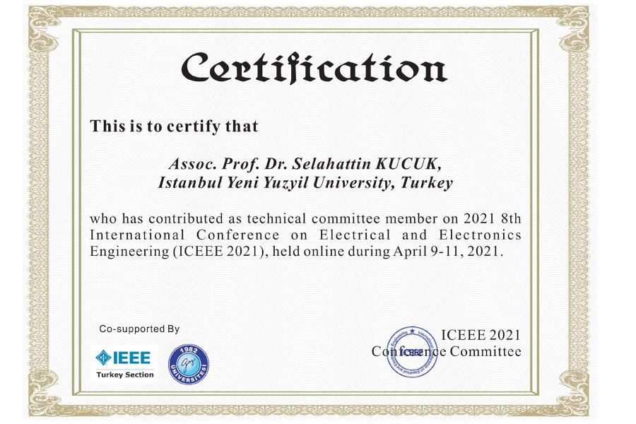 İstanbul Yeni Yüzyıl Üniversitesi Mühendislik Mimarlık Fakültesi, Elektrik-Elektronik Mühendisliği Öğretim Üyeleri Doç. Dr. Selahattin KÜÇÜK ve Dr. Öğretim Üyesi Cihan Döğüşgen ERBAŞ, 9-11 Nisan 2021 Tarihleri arsında Antalya’da düzenlenen Uluslararası 8th International Conference On Electrical And Electronics Engineering (ICEEE 2021) adlı konferansın teknik komitesine seçilerek, başarılı değerlendirmeleri sonucunda Üniversitemiz adına sertifikalar almışlardır.