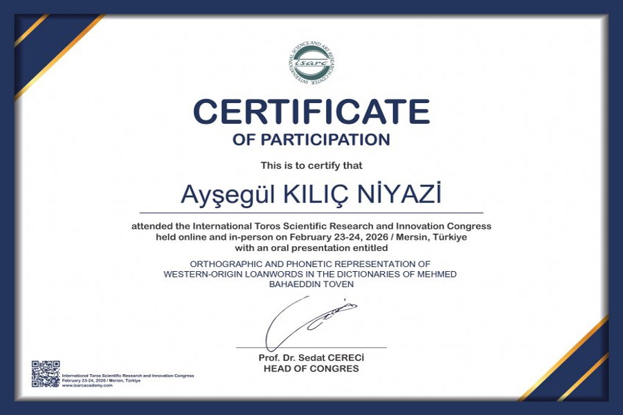 İstanbul Yeni Yüzyıl Üniversitesi Fen-Edebiyat Fakültesi Türk Dili ve Edebiyatı Bölümü Araştırma Görevlisi Ayşegül KILIÇ NİYAZİ, 23–24 Şubat 2026 tarihlerinde düzenlenen 1. Uluslararası Toros Bilimsel Araştırmalar ve İnovasyon Kongresi’nde bildiri sundu.