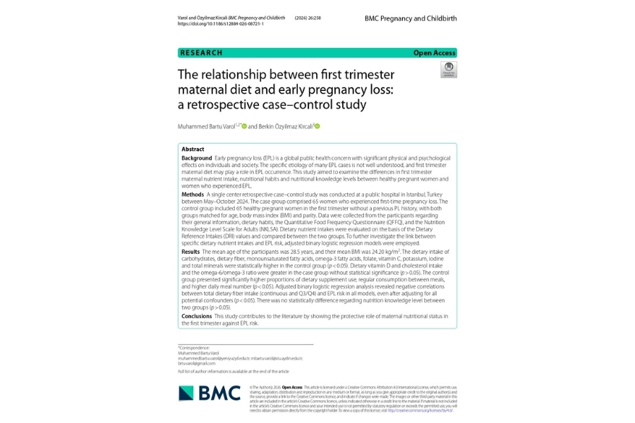 Üniversitemiz Sağlık Bilimleri Fakültesi Beslenme ve Diyetetik (İngilizce) Bölümü Öğretim Elemanı Arş. Gör. Muhammed Bartu Varol'un, "The relationship between first trimester maternal diet and early pregnancy loss: a retrospective case–control study" başlıklı bilimsel makalesi, WOS'da SCI-E Q1 kategorisinde yer alan BMC Pregnancy and Childbirth dergisinde DOI: /10.1186/s12884-026- 08721-1 numarasıyla yayınlandı.