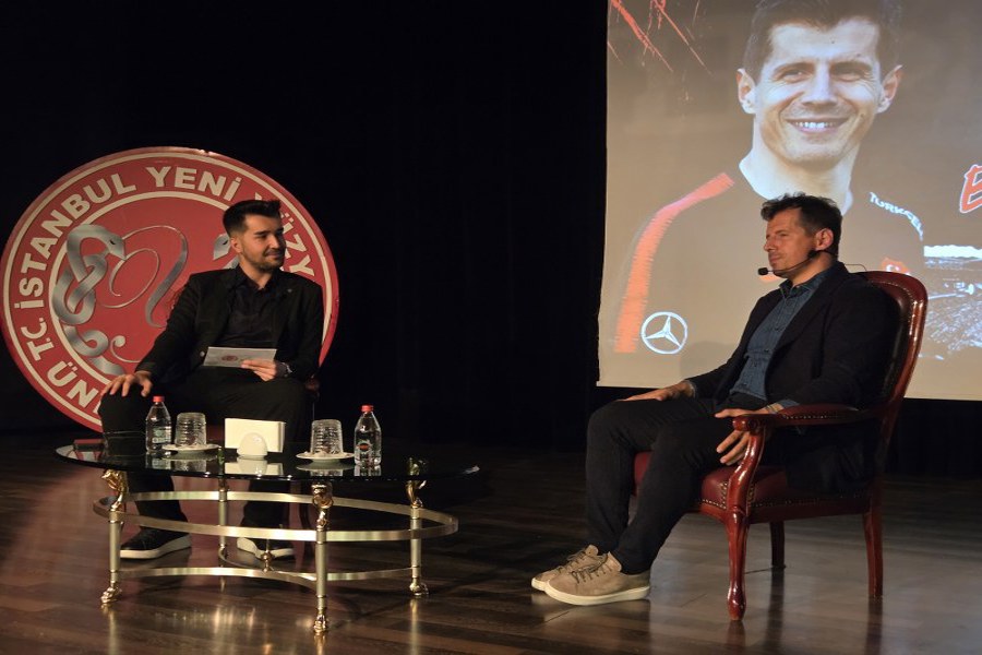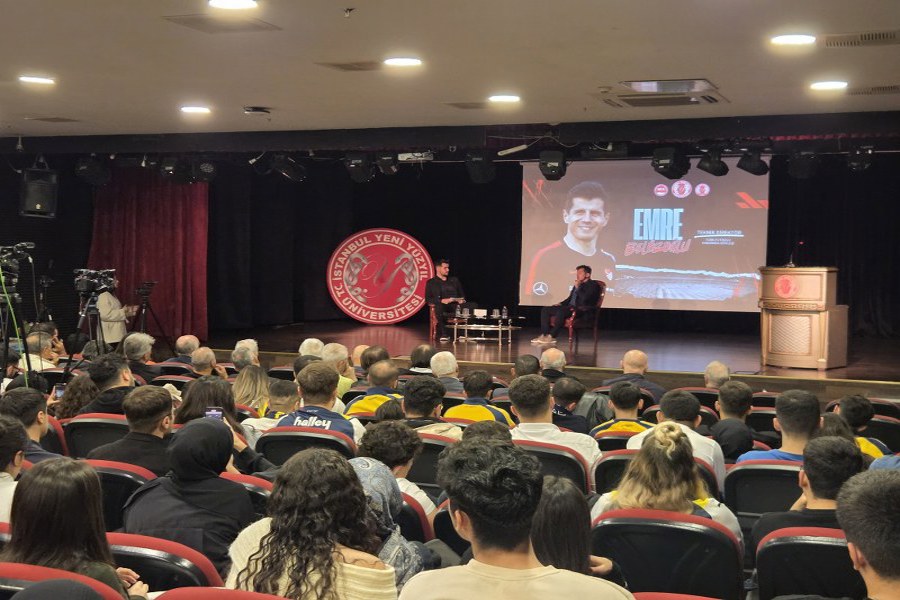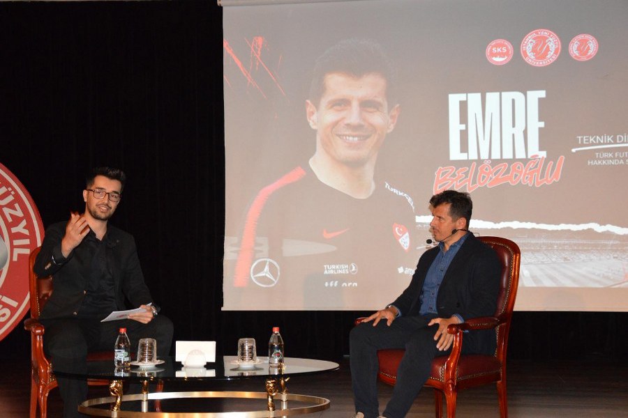 Üniversitemiz tarafından düzenlenen söyleşi kapsamında, Türk futbolunun önemli isimlerinden Teknik Direktör Emre Belözoğlu, öğrencilerimizle bir araya geldi. Alev Ofluoğlu Konferans Salonu'nda gerçekleşen etkinliğe yoğun katılım sağlandı. Söyleşinin moderatörlüğünü Kurumsal İletişim Daire Başkanlığı’ndan Fatih Atalay Demir yaparken, etkinliğe Rektör Yardımcısı Prof. Dr. Emir Tan, akademisyenler, Emre Belözoğlu'nun Şehremini Lisesi'nden öğretmenleri ve öğrenciler katıldı.