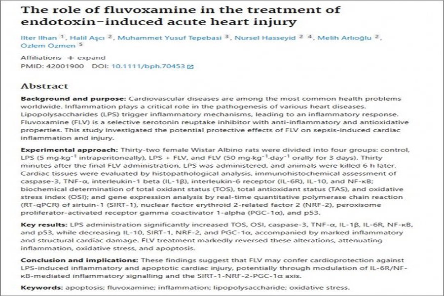 Üniversitemiz Tıp Fakültesi, Tıbbi Farmakoloji Anabilim Dalı’nda Araştırma Görevlisi Dr. Nursel HASSEYİD’in “The role of fluvoxamine in the treatment of endotoxin-induced acute heart injury” başlıklı bilimsel makalesi Q1 kategorisinde indekslenen British Journal of Pharmacology dergisinde yayımlandı.